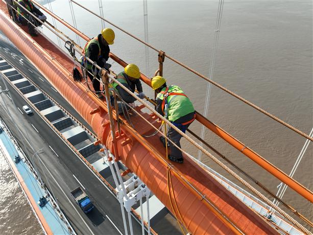 只見在西堠門大橋主塔塔頂,工作人員將模塊化的除濕設備一個個組裝起來,放在塔頂上橫梁位置。之后,開啟除濕機,干燥空氣從主塔塔頂的空氣制備站中輸出,經由送氣管道到達全橋所有主纜內部,最后在排氣夾排出,保障主纜鋼絲不發生腐蝕現象。“這次在主塔兩側一共安裝4組除濕機,每一側安裝兩組,一組主設備一組備用設備,確保除濕功能的持續性。”舟山管理中心項目負責人說。傳統除濕機組只有一臺主設備,為保障除濕功能的連續性,滿足長時間除濕的需求,橋梁養護工作人員設計了一主一備并聯型除濕機組。日常以傳統除濕機組即主除濕機組工作為主,高溫高濕環境下,視情況啟用備用機組,或同時開啟主、備用機組,提升除濕效率。此外,該備用除濕機組是橋梁養護工作人員自主研發的濃縮除濕機,采用“濃縮冷卻串聯”創新式除濕設計,屬國內首創,具備恒定除濕能力,基本不受季節等外界環境因素影響,確保在復雜的海洋氣候環境下,為主纜除濕工作提供更強力更有效的保障。